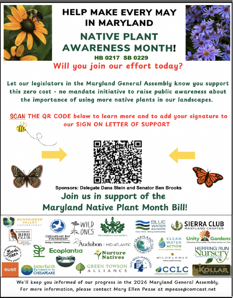 In 2026, Wild Ones chapters across the state of Maryland are supporting HB 217/SB 229, a bill to permanently establish May as Native Plant month in Maryland. The Greater Frederick Maryland chapter is a part of this effort.